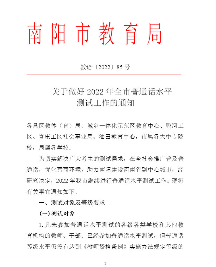 为切实解决广大考生的测试需求,在全社会推广普及普通话,优化营商环境,助力南阳建设河南省副中心城市,经研究决定,2022年我市继续进行普通话水平测试工作。现将有关事宜通知如下。