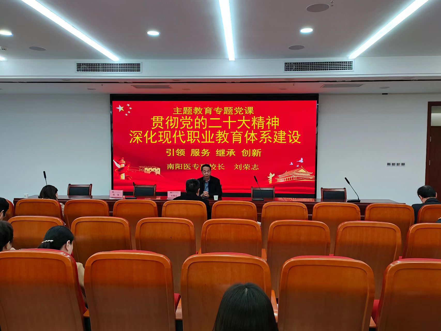 为深入学习贯彻习近平新时代中国特色社会主义思想,引导广大党员干部、教师学思想、强党性、重实践、建新功,在工作岗位上不断创新。11月22日下午,在仲景文化中心701会议室,校党委委员、副校长刘荣志以《贯彻党的二十大精神,深化现代职业教育体系建设》为题,为公共教学部全体教师上了一堂党课。
