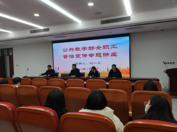 为深入学习宣传贯彻习近平法治思想,学习宣传贯彻中国工会十八大和省工会十六大精神,推动男女平等基本国策贯彻落实,大力营造全面维护女职工权益的良好氛围,按照我校总工会开展2024年女职工普法宣传月活动要求,公共教学部于3月20日在仲景文化中心7楼会议室举办了女职工法律知识讲座活动。公共教学部直属党支部书记李连焕、主任马纪伟、副书记郭嘉一、副主任吴建勇和公共教学部全体教职工参加讲座。