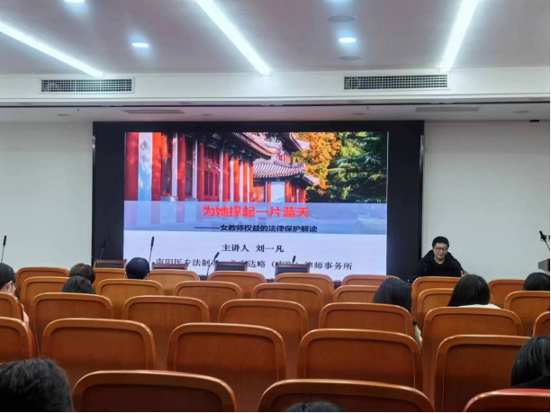 讲座邀请了南阳医专法制办教师、北京达略(南阳)律师事务所律师刘一凡为大家进行普法宣传。刘老师以《为她撑起一片蓝天——女教师权益的法律保护解读》为主题开展讲座,重点围绕家庭暴力、妇女的财产权益保护、妇女的劳动就业权益保障等方面进行了细致讲解。刘老师结合实际案例,对女教师在日常生活、工作中经常碰到的婚姻关系、财产分配、人身权益、劳动权益等方面的问题进行剖析,并提出了针对性的解决方法。
