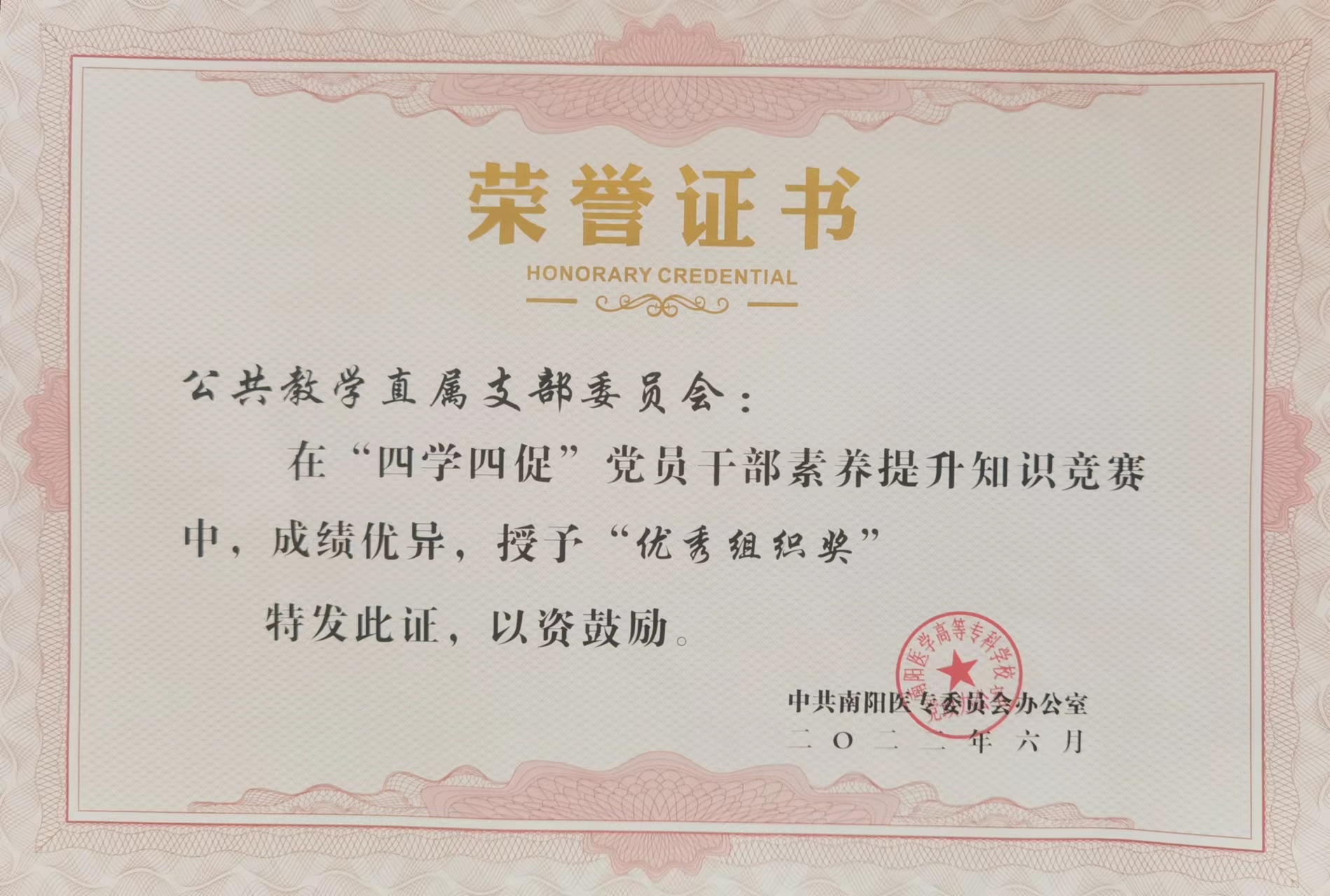 我部在学校6月1日组织的“四学四促”党员干部素养提升知识竞赛中荣获佳绩,优秀组织奖和2个优秀个人二等奖。