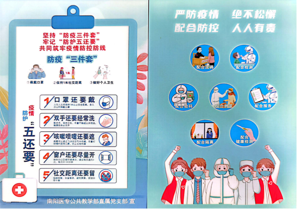 公共教学部直属党支部深入南阳医专家属院、深入群众,专门开展了一次疫情防控义务宣传活动,切实提高群众防控意识,引导群众牢记:坚持防疫“三件套”(佩戴口罩、保持1米社交距离、做好个人卫生),牢记“五个还要(口罩还要戴、社交距离还要留、咳嗽喷嚏还要遮、双手还要经常洗、窗户还要尽量开)”,共同筑牢疫情防控防线。