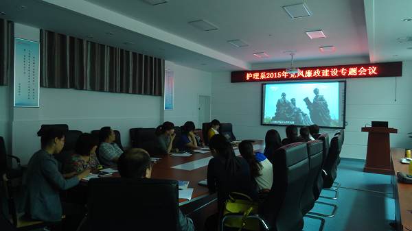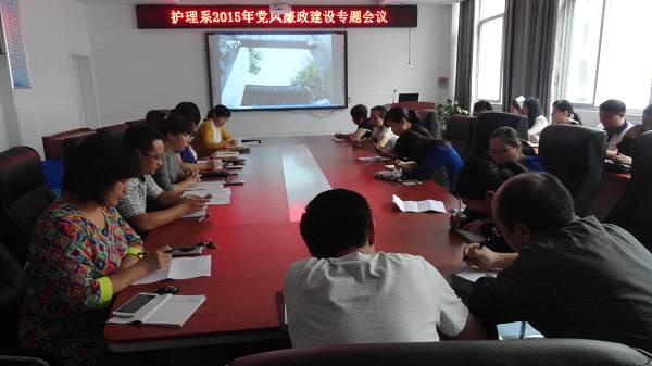 9月22日下午,护理系在系讨论室召开了2015年党风廉政建设专题会议。系党总支书记梁顺平同志首先传达了近期我校党风廉政建设和反腐败工作相关情况,总结回顾了我系上半年党风廉政建设工作情况,部署了下半年工作任务。指出深入推进党风廉政建设,不只是关乎党员干部的大事,也是关乎每个普通党员的重点问题,大家应该提高思想认识,克己奉公,严格自律。下一步我系还要继续加强对党员干部廉洁教育的内容和形式的创新,增强廉政文化建设的系统性、有效性,提升党总支的监督能力和监督水平。要继续纠正“四风”而不停息,“师德师风”建设长抓不懈,“学风”建设紧抓不松。系领导、副科级干部及全体党员教师参加了会议。