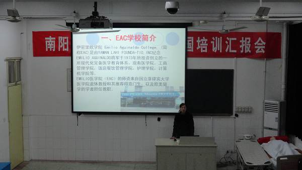 学成回国。两位教师对学校领导提供此次出国学习机会深表感谢,使其受益匪浅,她们从不同侧重点先后进行了学习汇报。任乐老师介绍了EAC师资力量、办学特色、教学态度、教学方法以及此次出国学习的内容,分析了国内外教育理念及护理模式的差异。陈英老师着重分享了个人学习英语的体会及菲律宾风土人情,分析了中西方医院管理差异。两位老师对我校今后教育教学工作提出了转变教学理念、善于学习总结、优化学生临床实习、提高英语口语能力等一些有益的建议,使大家深受启发。