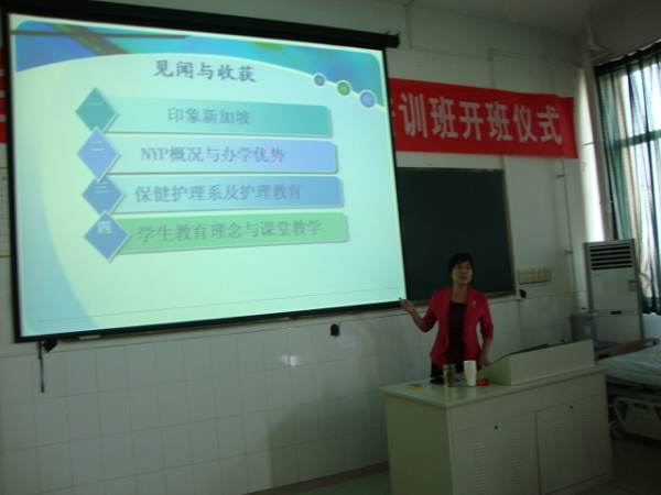 护理系副主任张欣宣读了《南阳医专护理专业教师培训方案》,明确了培训的内容形式、实施办法和具体要求。教师代表刘宇在发言中表态要珍惜机会,学有所获,为学校实现快速发展,评估取得优异成绩出力流汗。护理系主任范真要求全体教师谨遵教诲,不负重托。培训期间认真听,详细记,勤思考,多动手,确保培训效果,为提高教育教学水平,提高学生动手能力,打造专业品牌奠定良好基础。开班仪式结束后,范主任以《借鉴中提高,压力下成长》为主题进行了近两个小时的首场培训,畅谈了她在新加坡的学习收获,使大家受益匪浅。