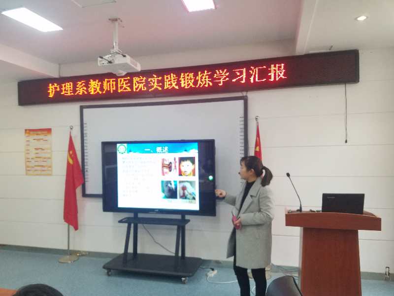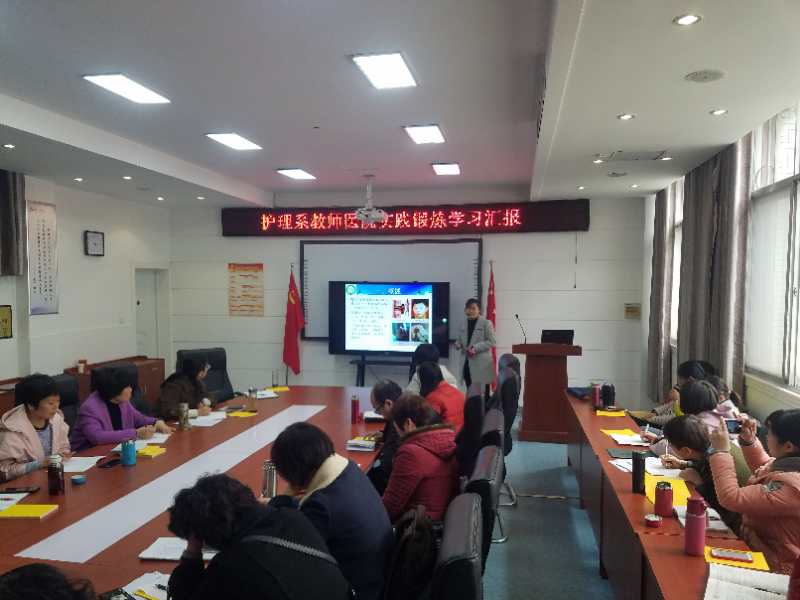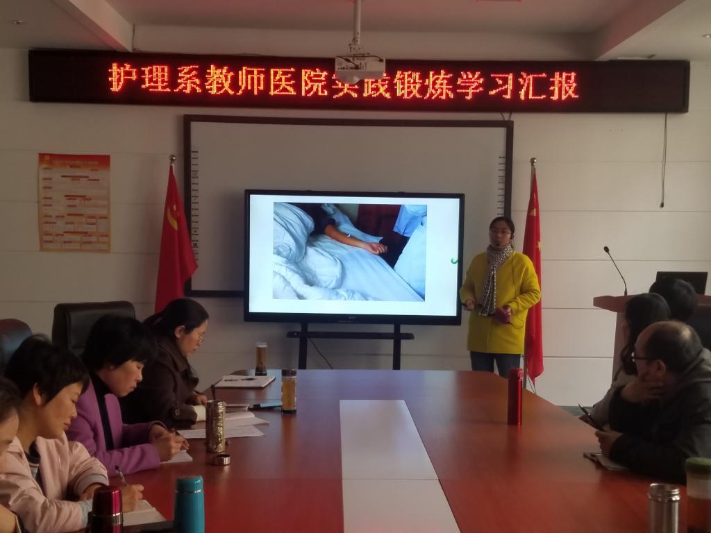 2018年1月8日至8月31日,护理系选派骨干教师朱冉、孙会、张延英3人,在南阳医专第一附属医院进行为期半年的临床实践。她们分别从内科、妇科、外科不同科室学习所获和感悟做了具体的汇报。