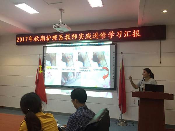 首先,基础护理教研室主任吴俊晓汇报了2016年2月-6月赴天津医科大学的学习情况。吴老师简要的介绍了天津医科大学的建校历史、校园文化、教学模式和学历制度,重点讲解了在天津医科大学基护教研室的学习经历,从人才培养到师资培养,从理论教学到实训教学,和全体教师分享了津医先进的教学理念和管理方法,其中,集体备课和新教师、新课程试讲等一系列做法得到了全体教师的一致推崇。