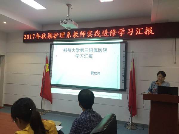 然后,贾松伟老师介绍了在郑州大学第三附属医院儿科进修的情况,她对郑大三附院规范化的管理制度、优质的服务意识、浓厚的学习氛围、吃苦耐劳的工作精神等方面阐述了自己的感悟。让老师们对医疗护理团队以安全为轴心,高效运转下细致化、人性化的管理理念有了更新的认识。