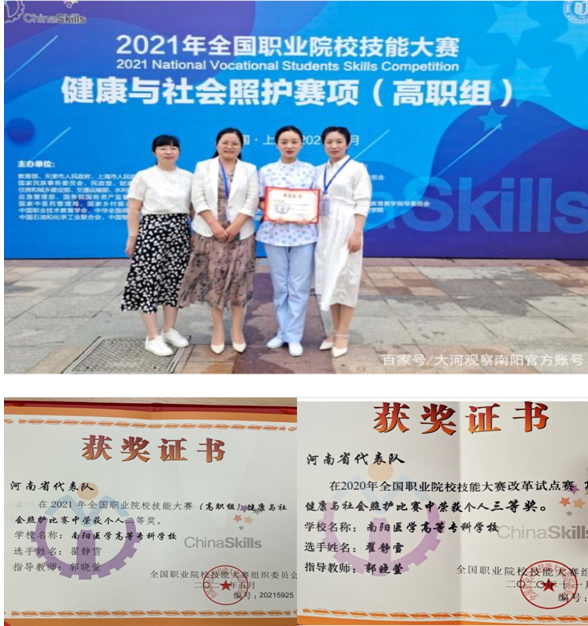 尤其是在2020年和2021年全国职业院校“健康与社会照护”比赛中,作为大赛指导教师,郭晓萱老师不畏困难、迎难而上,不分昼夜、不论周末,将所有时间和精力、心血都奉献在备赛中,与学生一起吃一起练一起研讨,遇到问题虚心请教专家、老师,攻克了一个又一个难关。备赛期间孩子肺炎住院,领导说,今天是周末休息一下,回去照顾一下孩子。郭老师却说,大家牺牲周末时间聚在一起集训不容易,比赛在即,时间紧急,孩子就有由家人照顾吧。比赛项目其中一项是画海报,郭老师亲自设计海报版面,然后找擅长美术的学生画出模版,反反复复设计了十几个版本,大家都说可以了挺好的,但她还是觉得不满意,亲自把南阳师院的美术老师请到学校,指导设计海报的版面,直到新的版面出炉,她才欣慰的说:“这才是我要的效果!”