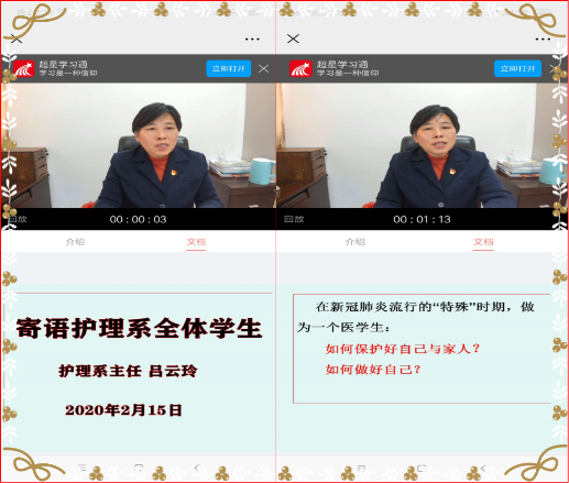 2月15日,护理系主任吕云玲通过学习通网络平台,在线上为全系同学做了开课前动员讲话。吕主任希望大家在新冠肺炎流行的特殊时期,学会保护好自己与家人,安心呆在家,也是做贡献,踏实上网课,高效获知识,珍惜和父母待在一起的美好上学时光。待到春暖花开之时,回到美丽向往的校院,感受那春意盎然的景象,熏陶那历史悠久的仲景文化。