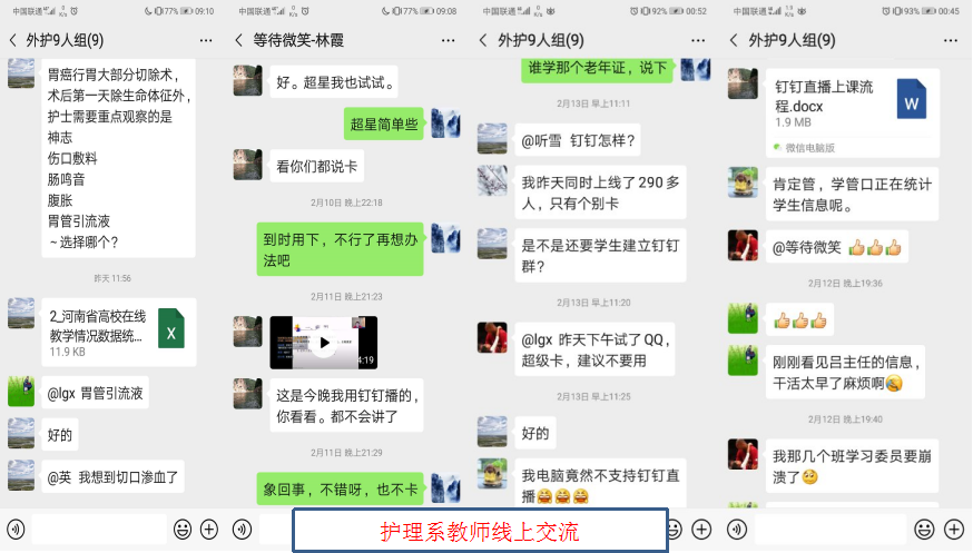 南阳医专开学季,新冠肺炎隔离了师生,但隔不断我们传播知识的热情!护理系钮林霞、李广霞、郑爽、褚青康等老教师,没因年龄停止前行,钮老师率先使用钉钉,并编写了使用流程。李老师郑老师、褚老师屡次尝试学习通,卡顿之后转学钉钉,敬业精神令人感动!为教好学、授好课!她们不耻下问在群中!谈质疑、说教法,护理系教师团队教风浓!感动同胞逆风行,虽然没能上一线,不忘初心酿学风!