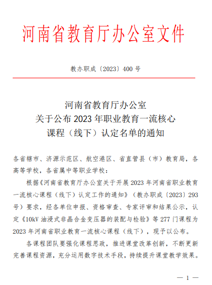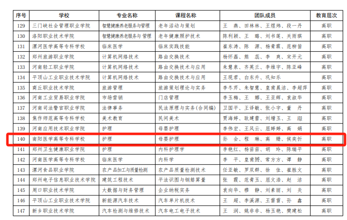 2023年11月8日,河南省教育厅公布了2023年河南省职业教育一流核心课程(线下)认定结果,南阳医学高等专科学校护理系获批《护理学基础》、《母婴护理》2门省级一流核心课程。
