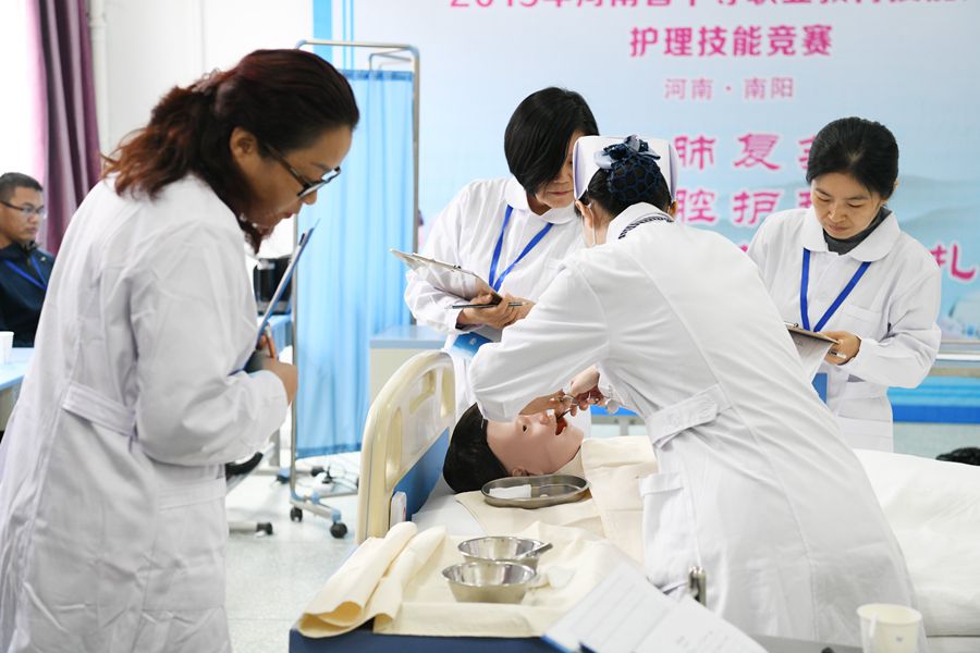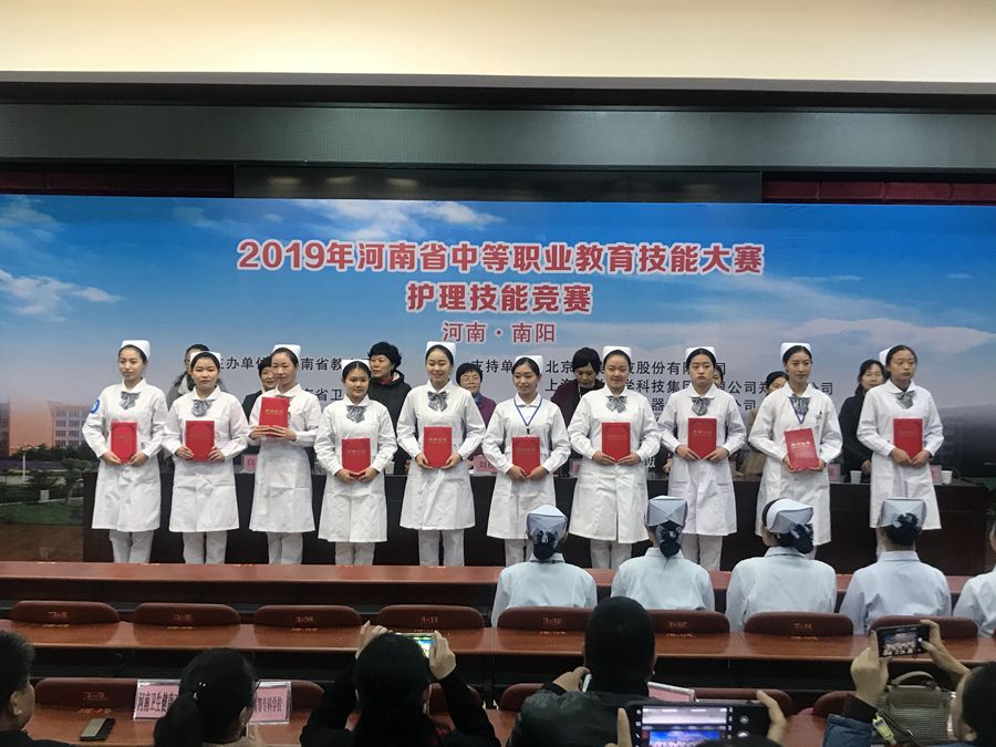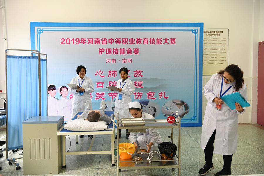 为进一步提高我省中等职业学校护理专业发展水平,深化各学校之间的交流与合作,日前,由河南省教育厅、河南省卫生健康委员会主办的2019年河南省中等职业教育技能大赛护理技能竞赛在我系成功举办。竞赛组委会特邀河南省卫健委科教处刘桂萍教授为比赛仲裁组组长,聘请了河南省肿瘤医院护理部主任刘东英等4位省级医院护理专家和2位南阳市级医院护理专家为竞赛裁判。赛场设在护理系实训楼2楼。