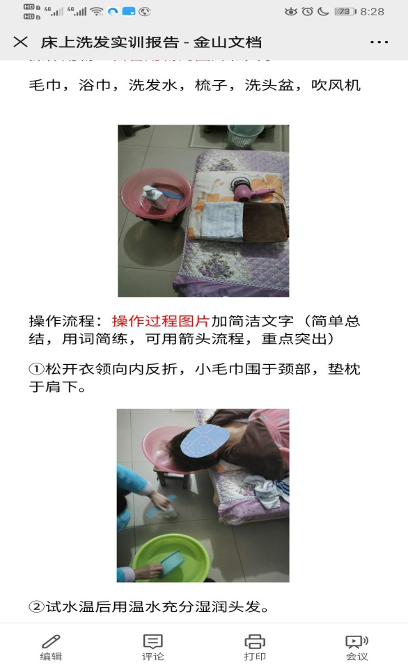 实训课前期主要以钉钉直播方式进行,使用“单纯靠PPT加视频辅助直播”的模式进入了各自的第一次“网络直播课”。为了让学生能够尽量掌握网课所授的技能,在与理论老师沟通后,本阶段我们选择了讲授更加贴近生活的护理技能,如头发护理、口腔护理、物理降温等项目,建议学生在家开发利用一切可以利用替代的物品工具,邀请家人帮忙,进行实训操作练习:如洗发时使用扣杯法或自制马蹄形垫,为自己的父母洗一次头发,既进行了练习,又进行了思政教育,促进了同学们练习的积极性。同时,我们还设计了实训作业,要求学生拍摄练习图片或小视频,与作业一起提交,学生表现出了极高的创新能力和主观能动性,提交了各种具有鲜明特色的图文并茂的实训报告。这些方法方式得到了大部分学生的支持与肯定,认为能够学习到应学的知识与技能。直播课结束后,在学习通或钉钉进行解惑,将播放的操作视频和制作的PPT课件传到学习或钉钉班级群上,以方便网络不稳定的同学下课自学,并根据学习通上学生作业的完成情况查漏补缺,及时调整授课内容。