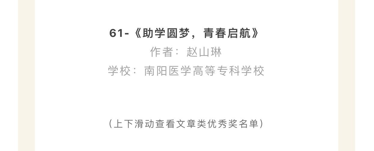 今年3月份,护理系接到学校学生资助中心发布的“助学圆梦,青春启航”主题征稿活动通知后,第一时间制定《护理系“助学圆梦 青春启航”主题征稿活动》,各班级精心准备,同学们广泛参与。经过个人(团队)申请,班级推荐,护理系共收到作品133件,其中文字类98件,视频类35个,并将优秀作品推荐至全国参赛。最终,护理系2022普大护理4班赵山琳获得文章类优秀奖。全国评出文章类优秀奖100名。