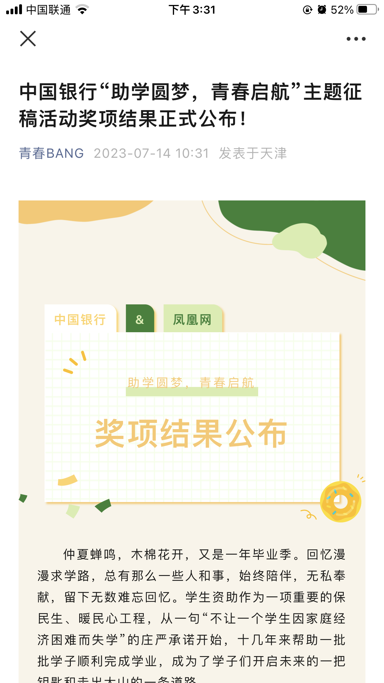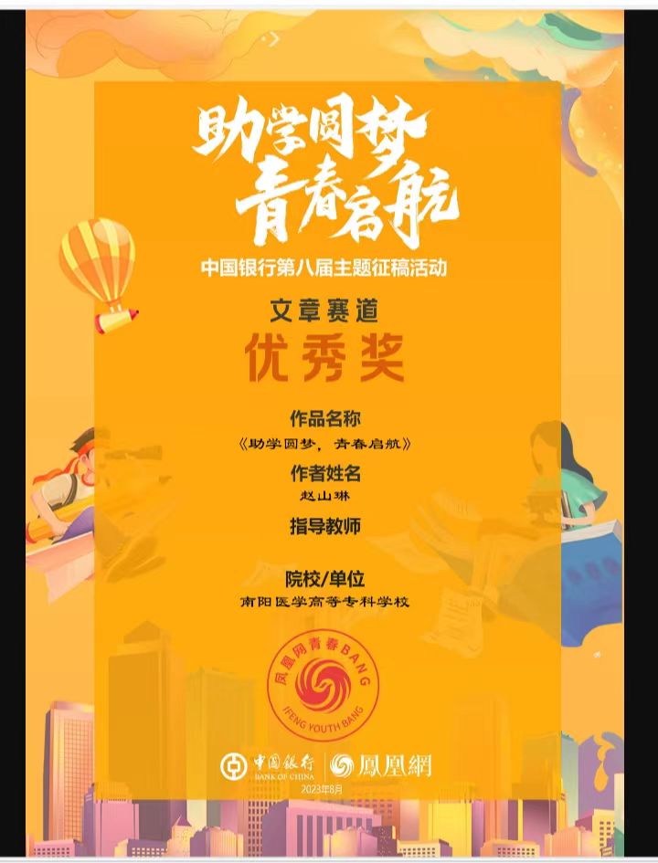 2023年7月14日,教育部全国学生资助管理中心联合中国银行、凤凰网发起的以“助学圆梦,青春启航”为主题的全国征稿活动获奖结果公布,护理系学生赵山琳在全国14970项参赛作品评比中脱颖而出,荣获文章类优秀奖。自2013年始,教育部全国学生资助管理中心联合中国银行、凤凰网连续举办七届征文活动,参与活动师生达50万人次。