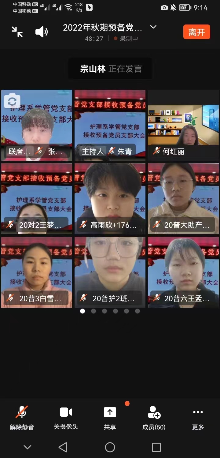 2022年12月1日上午,护理系学管党支部通过钉钉线上召开预备党员接收大会,讨论并决定梁淇等35名发展对象的入党问题,支部全体党员参加了会议。