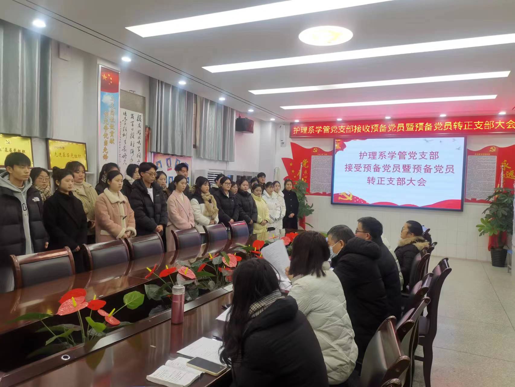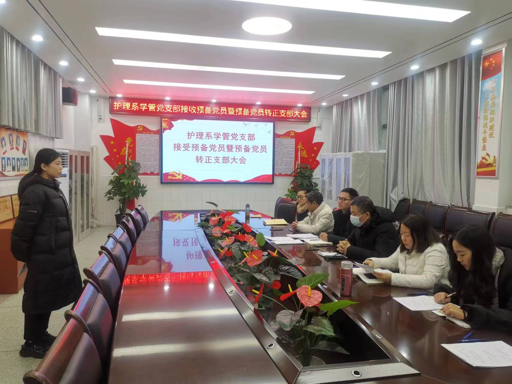 2023年12月13日上午,护理系学管党支部召开接收预备党员暨预备党员转正支部大会,讨论并决定赵英利等39名发展对象的入党和预备党员杨蜜乐的转正问题,支部在家党员参加了会议。
