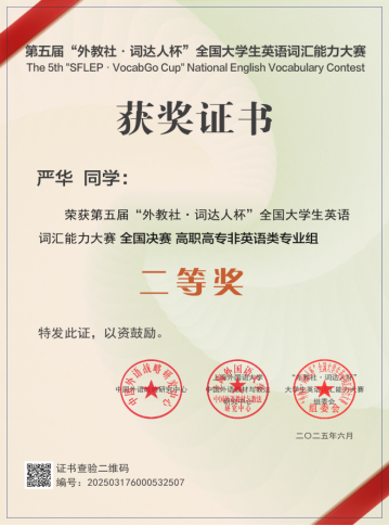 本网讯(文/国际教育学院 朱晗)近日,由中国外语战略研究中心、中国外语教材与教法研究中心和上海外语教育出版社联合主办的第五届“外教社·词达人杯”全国大学生英语词汇能力大赛全国决赛圆满落幕。我校斩获国赛二等奖1项,省赛特等奖2项,一等奖7项。
