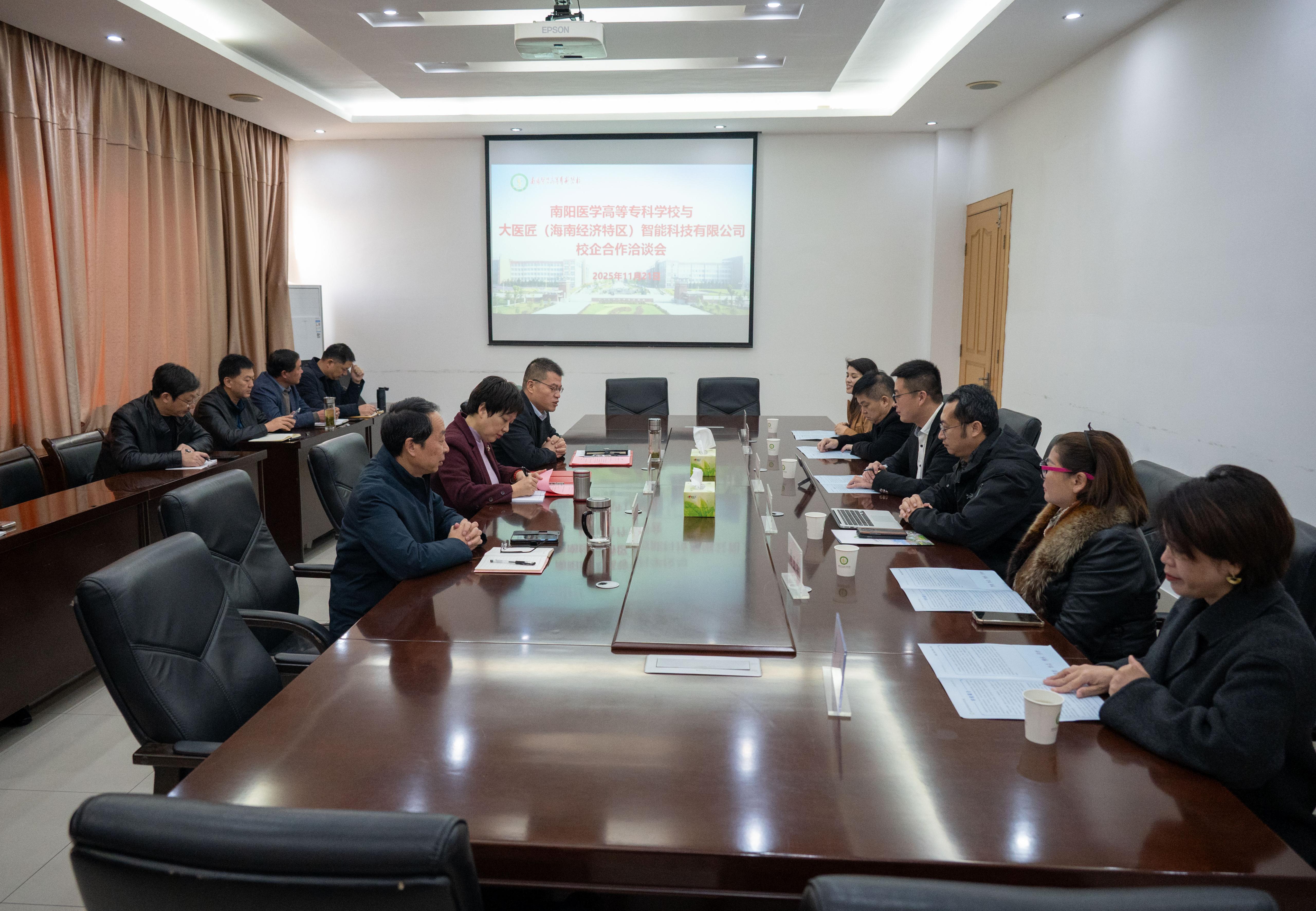 本网讯(文/教务处 李梦华)11月21日,我校与大医匠(海南经济特区)智能科技有限公司校企合作洽谈会在仲景西区行政楼会议室举行。大医匠科技董事长王峰、总经理黄炳儒及市场合伙人团队,校长范真、副校长刘荣志及学校相关部门负责同志出席,共商智能医疗领域深度合作事宜,会议由党委副书记刘涛主持。