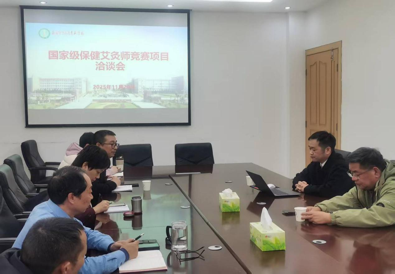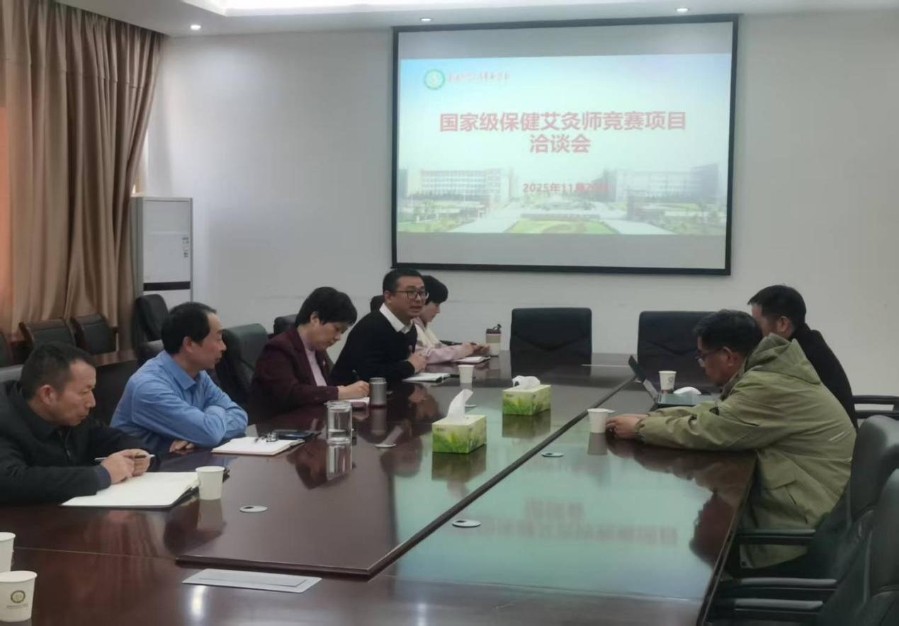 本网讯(文/教务处 李梦华)11月20日下午,我校与国控东森中医药科技有限公司在行政楼2号会议室开展合作洽谈会。原南阳市中医药发展局副局长张长河,国控东森中医药科技有限公司总经理忽学峰,校长范真,副校长刘荣志出席,学校相关部门负责同志参加。双方围绕“国家级保健艾灸师竞赛项目”展开合作交流。