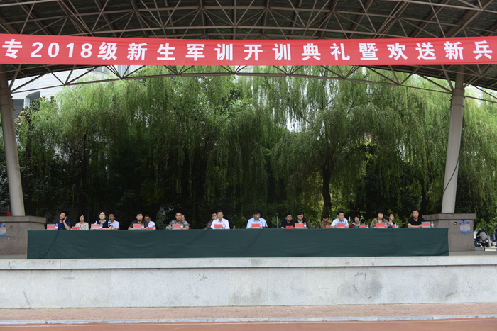 本网讯(文/学生处 梁卡军)今年的9月10日是第34个教师节。在这丹桂飘香、喜庆丰收的美好日子里,南阳医专2018级新生军训开训典礼暨欢送新兵仪式在主校区足球场隆重举行。学校纪委书记张国良,副校长郭万周,中国人民解放军32143部队科长高尚飞,党办、校办、宣传部、教务处、武装部的主要负责同志和各系(部、院)书记出席典礼。大学生应征入伍的新兵代表、承训官兵、各系(部、院)学工办主任、2018级全体辅导员、班主任和6800多名新生参加开训典礼。党委学工部部长、武装部部长孟晓红主持典礼。