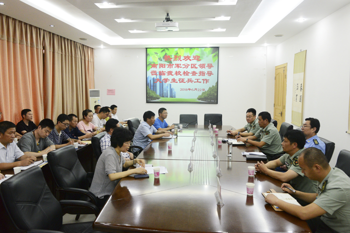 本网讯(文/学生处 余飞海)6月22日上午,南阳军分区领导深入我校检查督导大学生征兵工作进展情况,实地考察了征兵工作站,查阅了相关材料,并召开了座谈会。南阳市委常委、军分区司令员季陵,政委李运斗,动员处处长卢成轶,校领导方家选、郭万周,卧龙区武装部领导杨美、王金宝和我校武装部负责人以及各系院党总支书记、学工办主任、征兵专干参加了座谈会。