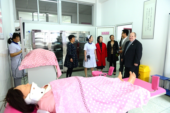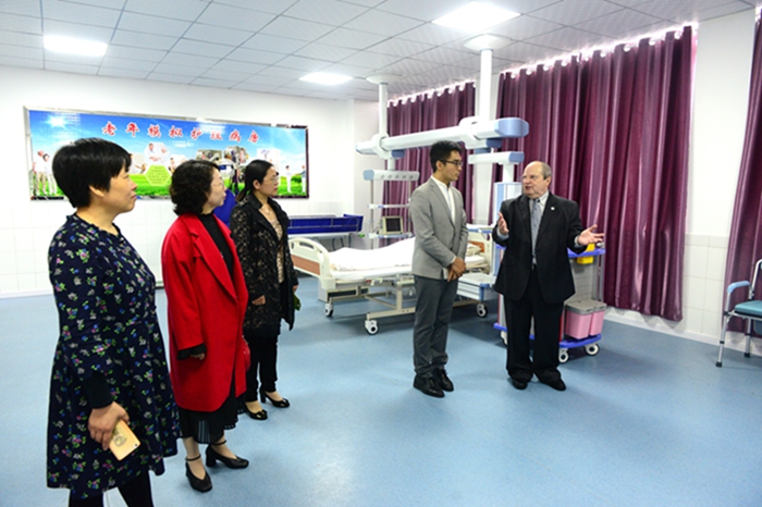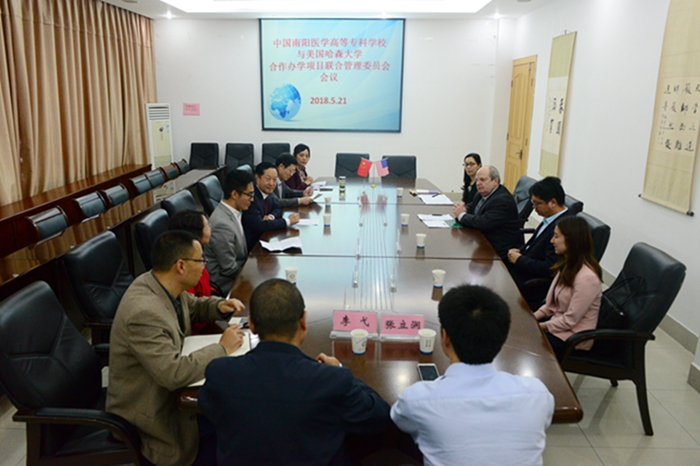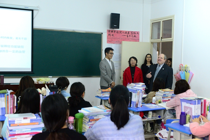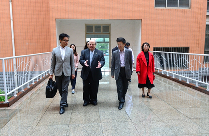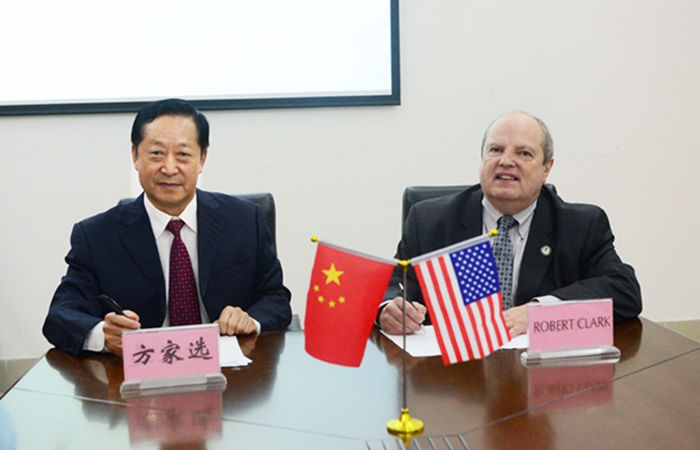 方校长和罗伯特.克拉克校长分别介绍了两校的基本情况,双方就中外合作办学项目教学管理、学生和教师交流培训、课程和学分对接等事项进行了广泛深入的洽谈,并举行合作项目签约仪式。访问期间,罗伯特.克拉克校长一行还实地考察了我校临床医学系、护理系、医技系、针灸骨伤系人体生命科学馆、中药标本馆、仲景文化特藏馆、一附院、二附院等教育教学部门和场馆。22日上午,罗伯特.克拉克校长在新东区礼堂做了一场关于美国大学教育的讲座,国际教育学院近600名师生现场聆听了讲座,许多学生积极与罗伯特.克拉克校长进行了交流与沟通。
