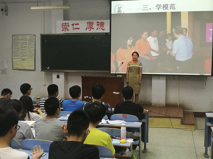 全体同学首先齐唱歌曲《最初的梦想》,大家围绕“初心”这个主题进行自我反思。随后,2016级网络班王燕同学发言,她在刚刚结束的第八届全国大学生计算机应用能力与信息素养大赛中,荣获两个个人单项一等奖。她通过分享自己备赛、参赛的经历,号召全体同学要不忘初心、勤奋学习、苦练技能,弘扬“撸起袖子加油干”的奋斗精神,努力使自己成长为建设现代化强国的合格人才。