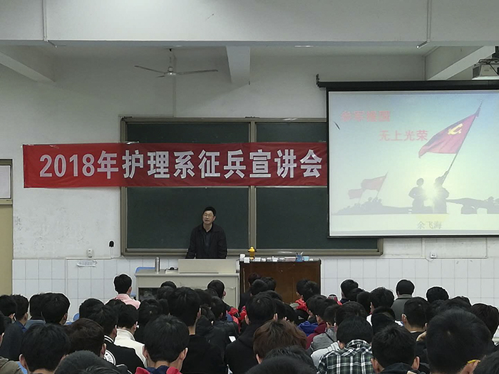 余飞海从大学生应征入伍的意义、条件、优惠政策、入伍流程四个方面给同学们进行了全面宣讲,他鼓励同学们响应祖国号召,投身国防建设,在军营这所大学校、大熔炉里成长成才、建功立业。护理系现役士兵15普大护理8班学生郭畔旭将自己的从军日记 “第一次打枪”等文章和部队的新兵训练、军营生活等方面和同学们真诚分享了他入伍后的收获和感悟。梁顺平书记强调,参军入伍“利国、利民、利家、利己”,她希望同学们向现役学生士兵看齐,把个人理想抱负融入强军梦、中国梦,携笔从戎献身国防,丰富人生经历,磨练身心意志,为实现中国梦、强军梦贡献自己的青春和才智。