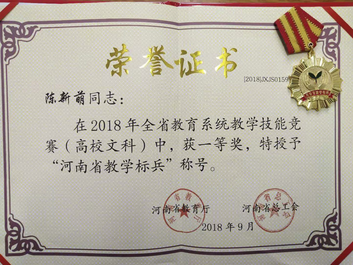 本网讯(文/政教部 李建效)根据河南省教育厅、河南省教科文卫体工会《关于在全省教育系统开展教学技能竞赛活动的通知》要求,政教部利用暑期开展了思政课青年教师教学技能竞赛,经过精心组织,严格选拔,推荐陈新萌老师参加由河南省教育厅、河南省教育工会在全省教育系统开展的2018年全省教育系统教学技能竞赛,陈新萌老师以扎实的理论功底、饱满的教学热情、精湛的教学技艺,赢得评委专家的一致认可和好评,荣获2018年全省教学技能竞赛(高校文科组)一等奖,并被授予“河南省教学标兵”荣誉称号。