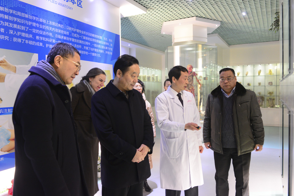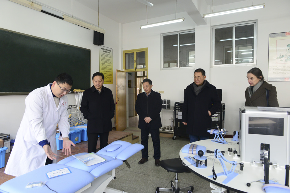 外籍专家实地考察了仲景文化特藏馆、人体生命科学馆和针灸骨伤系实验实训室。仲景文化特藏馆内丰富的中医文物、保存完好的医学古籍给来访专家留下了深刻印象,展示了医圣故里的深厚文化底蕴。人体生命科学馆内制作精良、多达5000余件的各种人体解剖标本、病理解剖标本和人体寄生虫标本更是让专家赞不绝口。在针灸骨伤实训平台,专家实地勘察了信息化智能人体经络腧穴实训室、标准化病人教学模拟门诊病房、展示中国骨科发展水平的骨科实训室、功能齐全的康复评定治疗设备等,对我校教育教学实训在传统针灸、骨伤、康复方面的办学水平给予了较高评价。