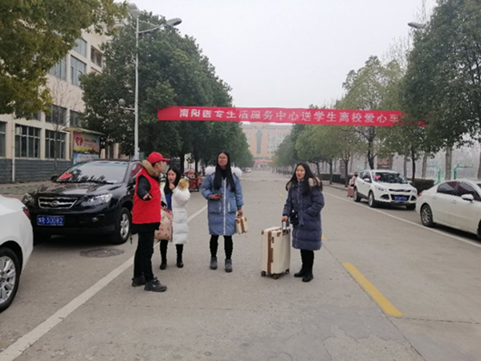 本网讯(文/生活服务中心牛超)2019年1月18日至19日,是我校学生放假离校的高峰日,为了方便学生假期出行,保障学生安全离校,生活服务中心组建爱心车队,免费送学生到火车站、汽车站,让学生踏上温暖的回家之旅。