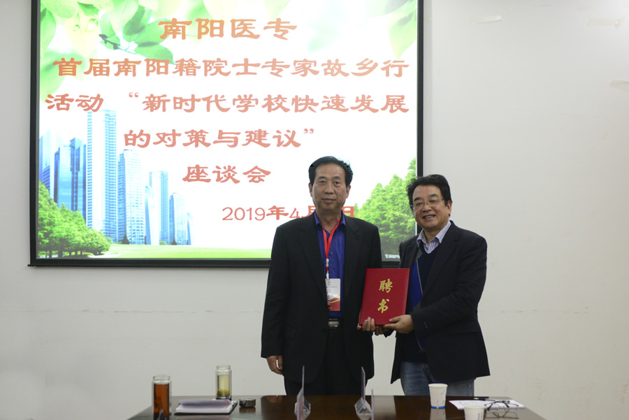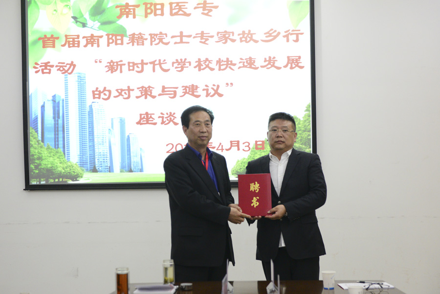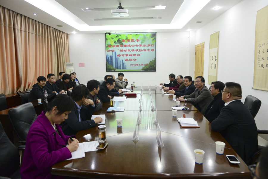 参观结束后,召开了“新时代学校快速发展的对策与建议”座谈会,受邀专家、学校有关领导和相关部门负责人参加,会议由校长方家选主持。校长方家选简要介绍了学校的基本情况。他对各位专家受邀来到南阳医专表示感谢。他说,各位专家都是南阳医专走出去的杰出人才,长期从事医疗科学研究工作,学养丰厚。虽身处他乡,但始终牵挂母校,愿意帮扶、领航、指引学校相关专业建设,是南阳医专发展史上的大事、喜事。专家们就新时代我校如何抓住机遇、突出办学特色、实现学校快速发展、上档升阶出谋划策,为学校下一步发展规划提出了有价值的参考意见。陕西千金方集团公司董事长武圣美当场表示再次向他建立的南阳医专武圣欧基金会拨款300万元,用以支持母校发展建设,奖励品学兼优、有志于中医药学习研究的学生。