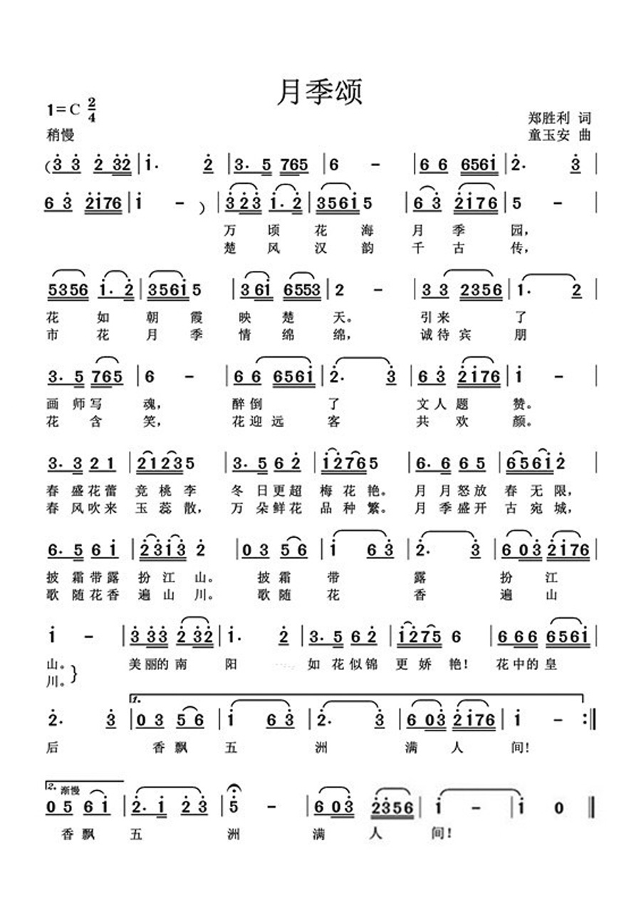 歌曲《月季颂》由郑胜利老师作词,童玉安老师作曲,邀请国家一级演员李庆芳演唱。优美舒缓的旋律,诗情画意的歌词,仿佛让人置身月季花海。两位老师说,在古稀之年,能看到南阳举办这样的国际性盛会,作为退休老人,我们也想为盛会出把力,用音乐表达心意,一个写词,一个谱曲,把这份深厚感情写进《月季颂》里,先先后后修改大约有30多次,以花生情,以情生花,情景相生,用月季唱出大美南阳生机无限,为世界月季洲际盛会高歌,用原创歌曲为盛会添光彩。
