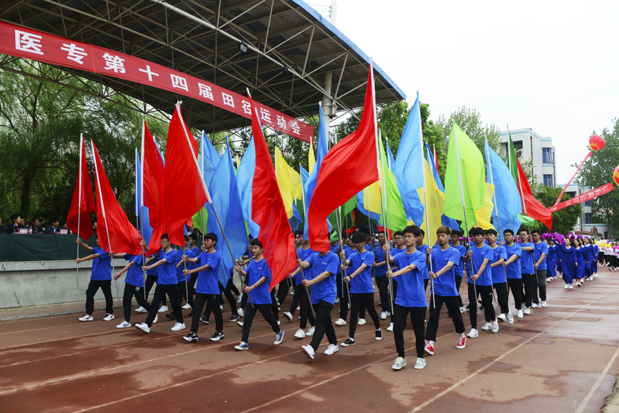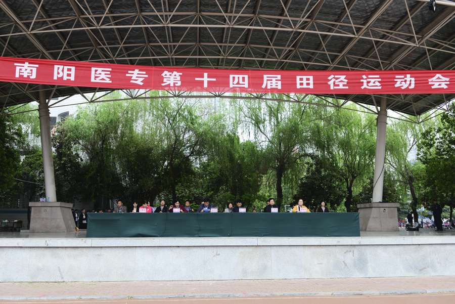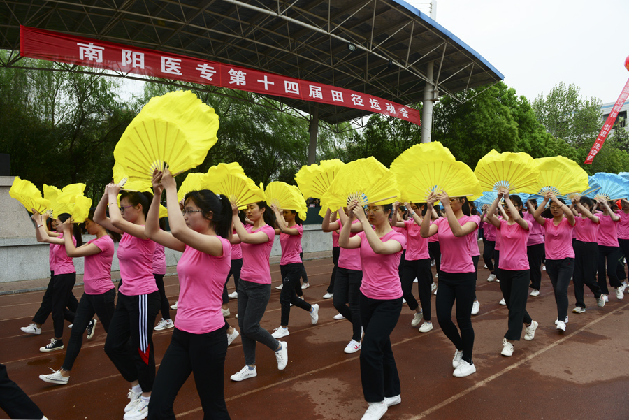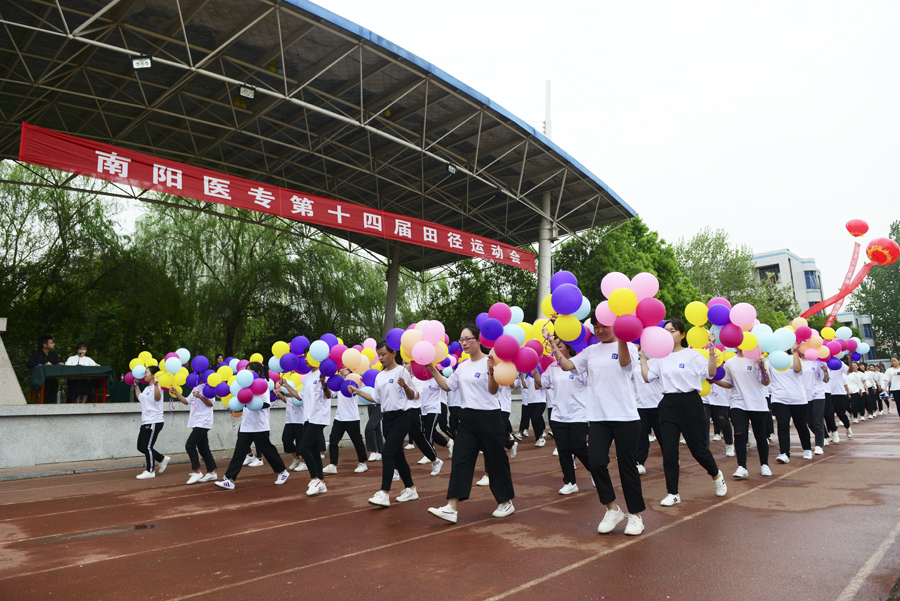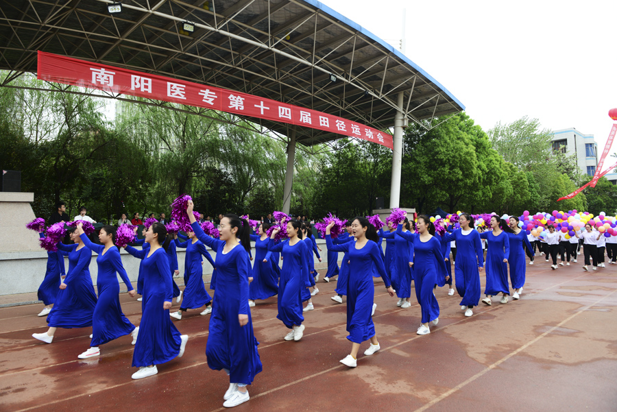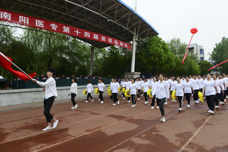 在雄壮的运动员进行曲中,国旗队、校旗校徽队、彩旗队,以及裁判员、运动员方阵依次入场。入场完毕后,全体起立奏唱《中华人民共和国国歌》。郭万周同志宣布组委会及仲裁委员会名单,逵应坤同志致开幕词。体育教学部李冰老师、临床医学系王焯阅同学分别代表裁判员及运动员进行宣誓。方家选同志宣布南阳医专第十四届田径运动会开幕。随后,由校团委组织,有体育教学部、护理系、针灸骨伤系、临床医学系、中医系、国际教育学院排练的文体表演队进行了精彩展演。