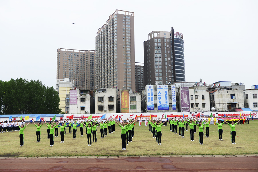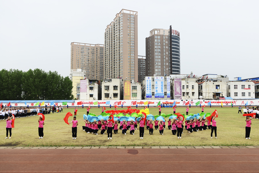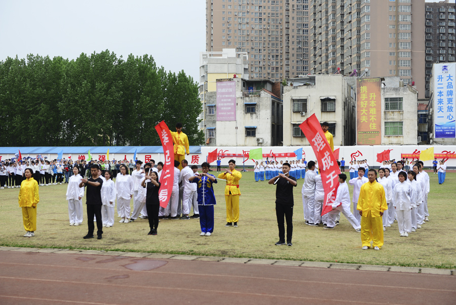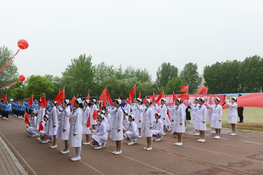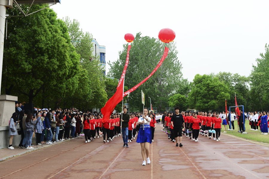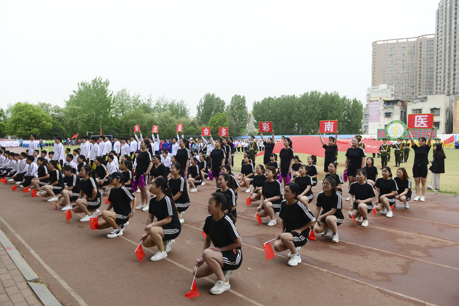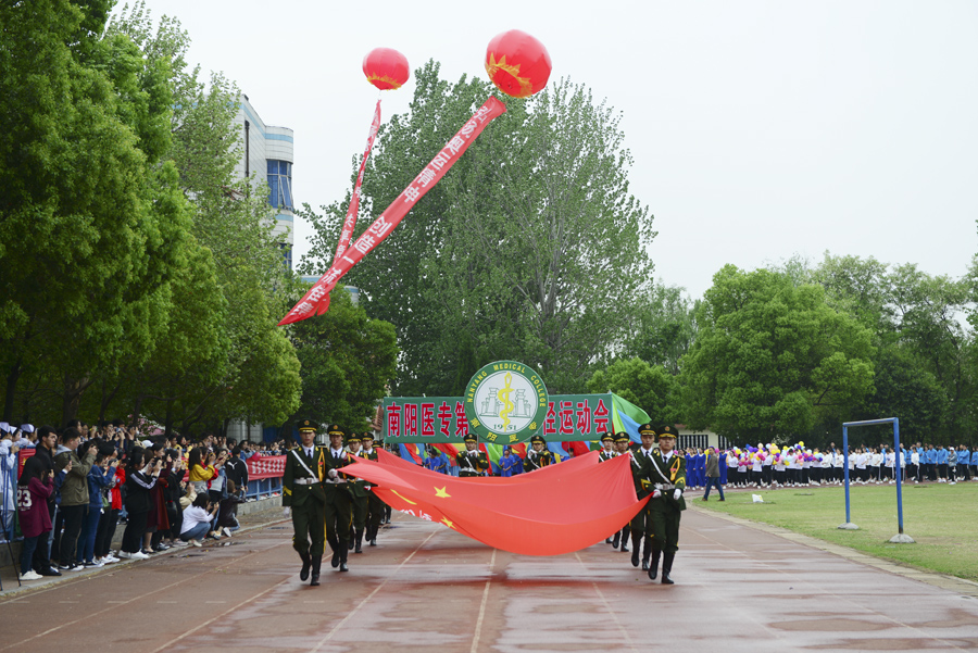 在雄壮的运动员进行曲中,国旗队、校旗校徽队、彩旗队,以及裁判员、运动员方阵依次入场。入场完毕后,全体起立奏唱《中华人民共和国国歌》。郭万周同志宣布组委会及仲裁委员会名单,逵应坤同志致开幕词。体育教学部李冰老师、临床医学系王焯阅同学分别代表裁判员及运动员进行宣誓。方家选同志宣布南阳医专第十四届田径运动会开幕。随后,由校团委组织,有体育教学部、护理系、针灸骨伤系、临床医学系、中医系、国际教育学院排练的文体表演队进行了精彩展演。