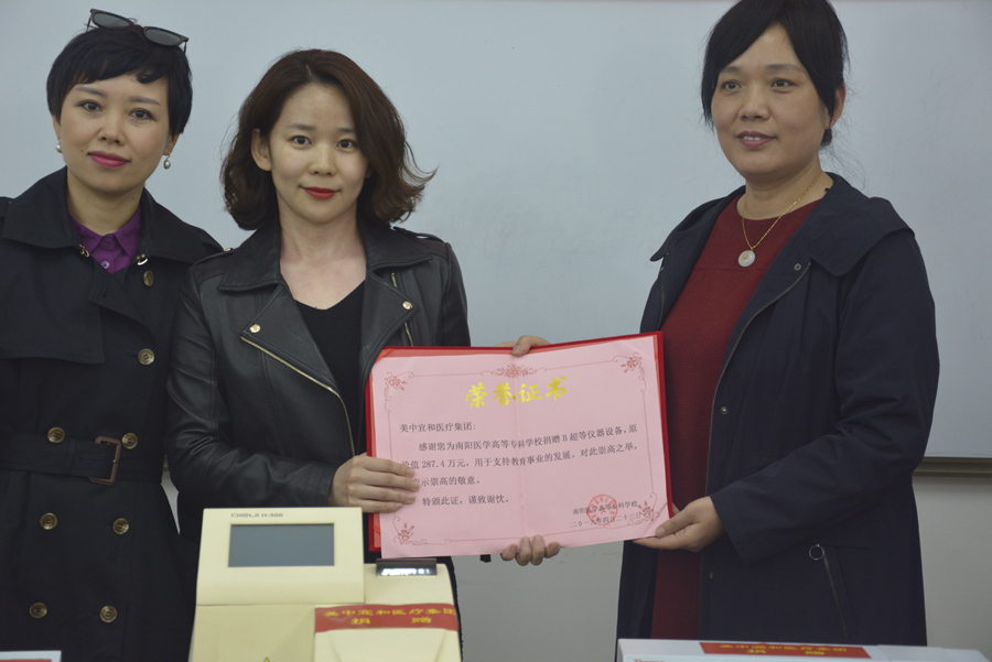 本次北京美中宜和医疗集团向我校捐赠的仪器设备有超声系统诊断仪、检验分析仪、电脑主机、显示器、打印机等,原值达284.6万元。在仪式现场,双方签署了捐赠协议,范真代表学校为美中宜和医疗集团颁发了荣誉证书。
