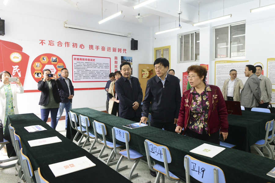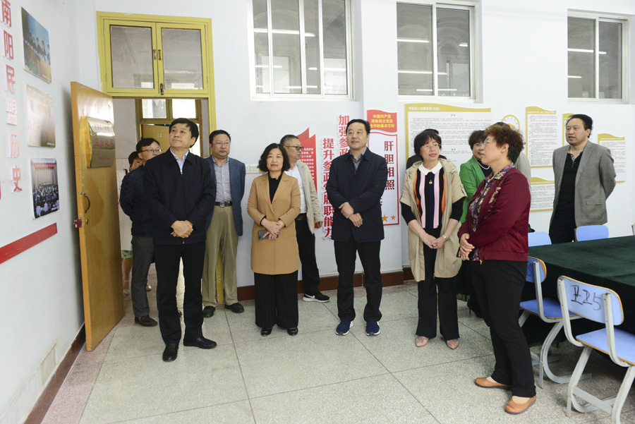 本网讯(文/组织部许海楠)5月7日上午,省委统战部副部长张利芳,省委统战部党派处处长李凯,市委常委、统战部部长刘树华,市委统战部常务副部长刘红跃等一行8人莅临我校调研民主党派建设工作,并考察了民盟南阳市委医专支部“盟员之家”。校党委书记全新明、副书记逵应坤陪同。(编审/杨金运摄影/宣传部)