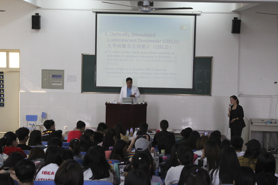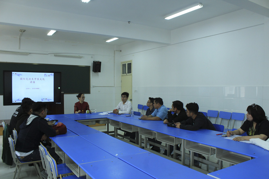 本网讯(文/国际教育学院李连焕)5月15日上午8点,我校合作院校来华交流生在仲景西区三号教学楼423教室学习《对外汉语》课程,由周国军老师授课。通过学习,交流生能够使用简单的中文打招呼、介绍自已、询问名字并进行简单对话。上午10点,在仲景东区中医系307教室肖跃红教授为交流师生讲解中医课,由周国军老师担任翻译。肖教授讲解了中医基础知识,举例说明了人体器官之间的相互作用,带领他们参观了中医系腹诊实训室、综合实训室并体验了仪器使用。本次学习课程使交流师生了解了中医文化,感受了中医魅力。