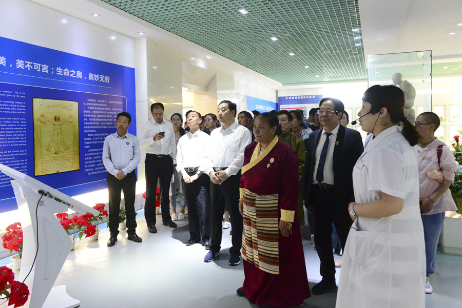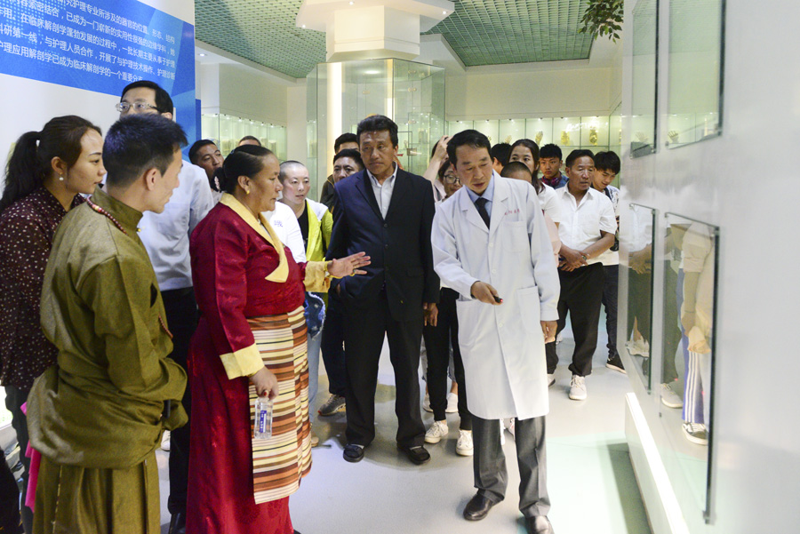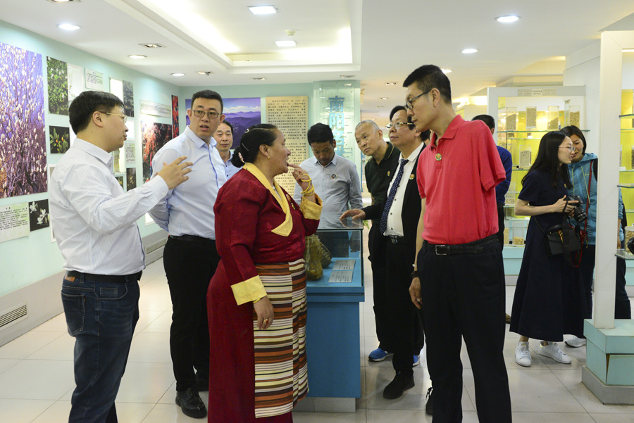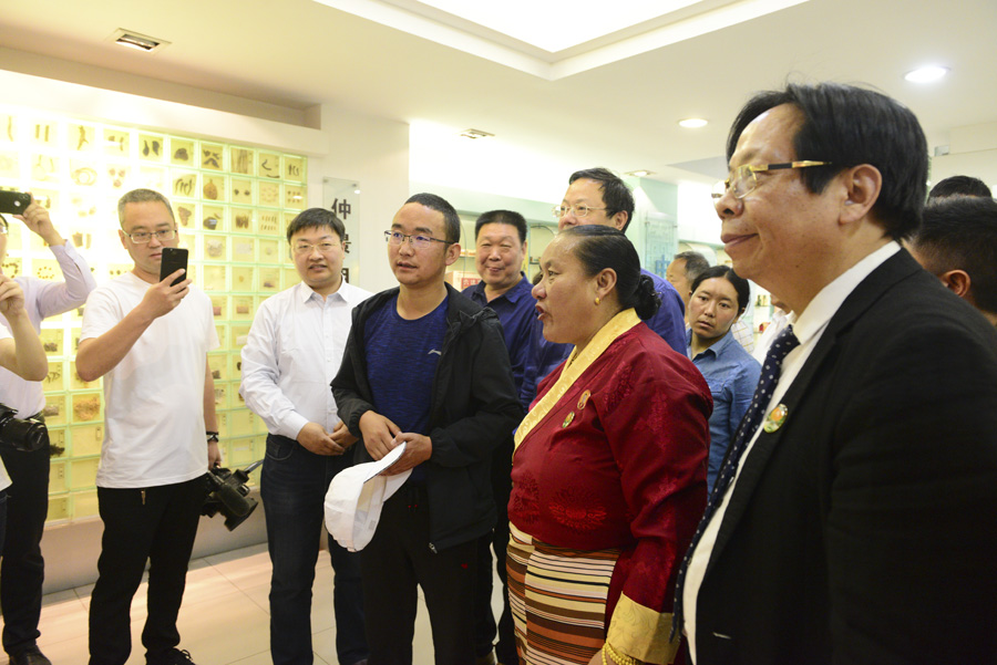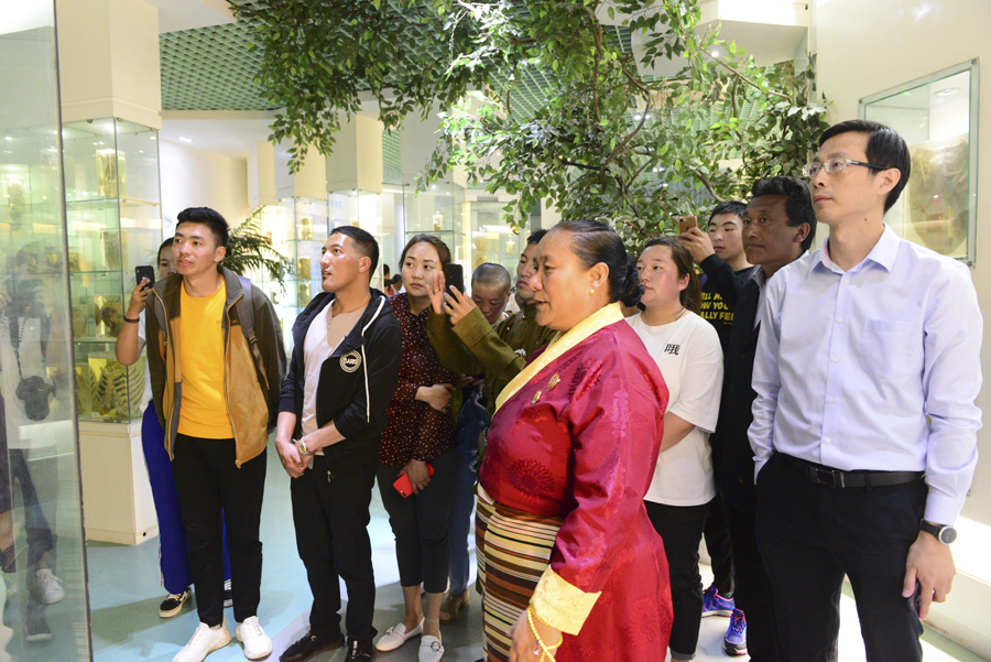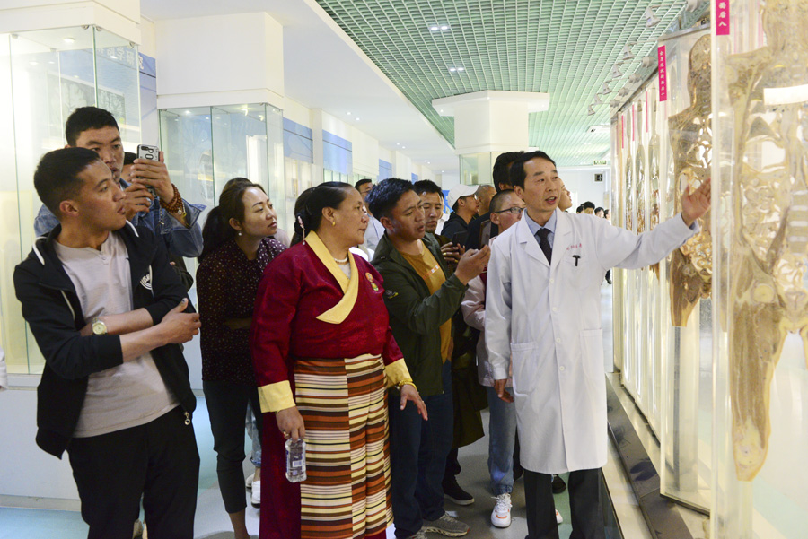 尧西·桑吉卓玛一行先后考察了我校人体生命科学馆和中药标本馆。一边参观一边感叹数千件人体标本的艺术魅力和中草药标本的多姿多彩,尤其是中医微创筋骨针法特色解剖标本、以八大宛药为代表的中草药标本,以及我校独有艾滋病影像断层解剖标本等,引起在场人员的极大兴趣和关注。尧西·桑吉卓玛有着极高的修养,医学知识也十分渊博,能够熟练地将讲解员的解说和自己的所见随口翻译给藏族学员,并能进一步阐释。