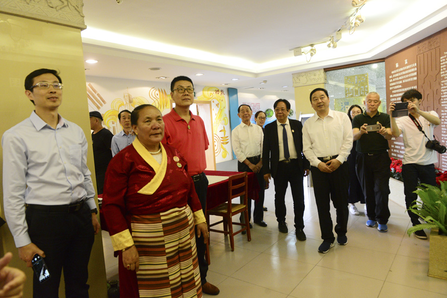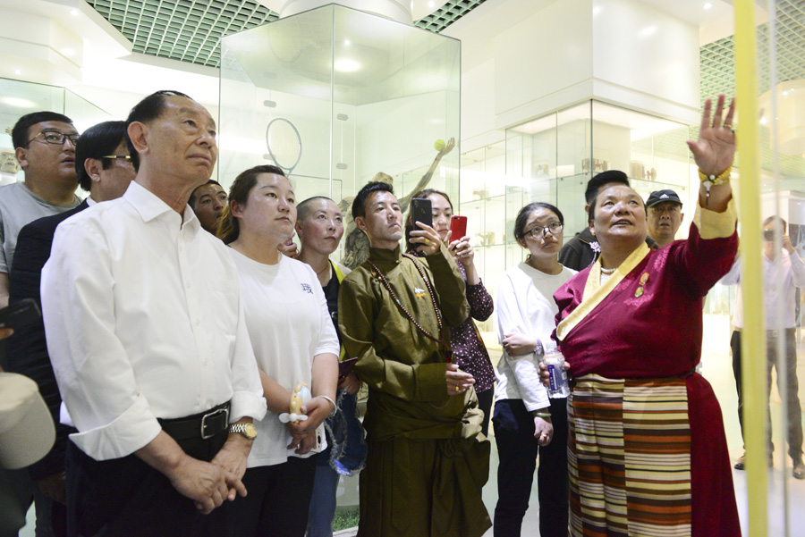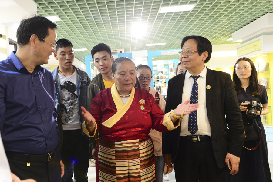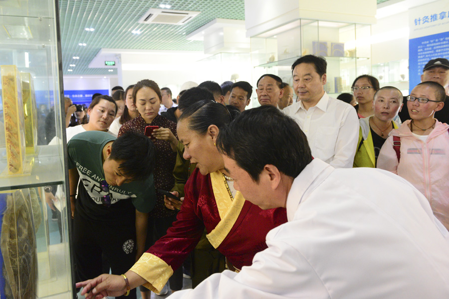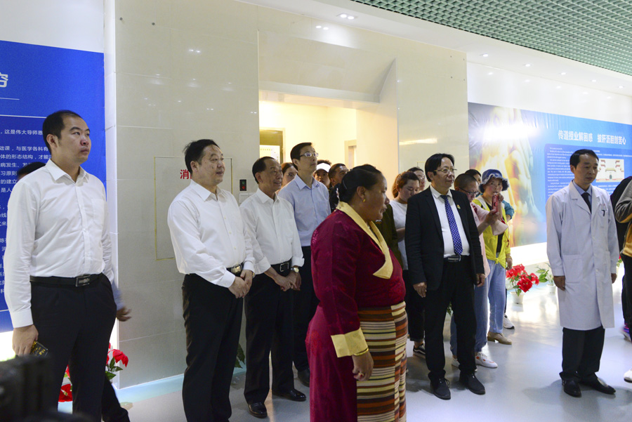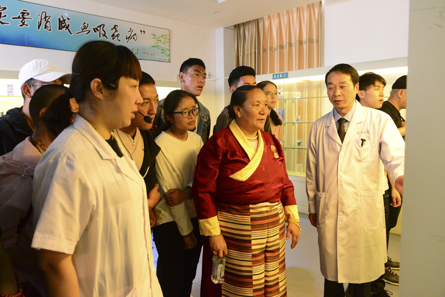 尧西·桑吉卓玛一行先后考察了我校人体生命科学馆和中药标本馆。一边参观一边感叹数千件人体标本的艺术魅力和中草药标本的多姿多彩,尤其是中医微创筋骨针法特色解剖标本、以八大宛药为代表的中草药标本,以及我校独有艾滋病影像断层解剖标本等,引起在场人员的极大兴趣和关注。尧西·桑吉卓玛有着极高的修养,医学知识也十分渊博,能够熟练地将讲解员的解说和自己的所见随口翻译给藏族学员,并能进一步阐释。