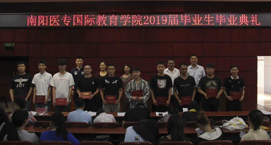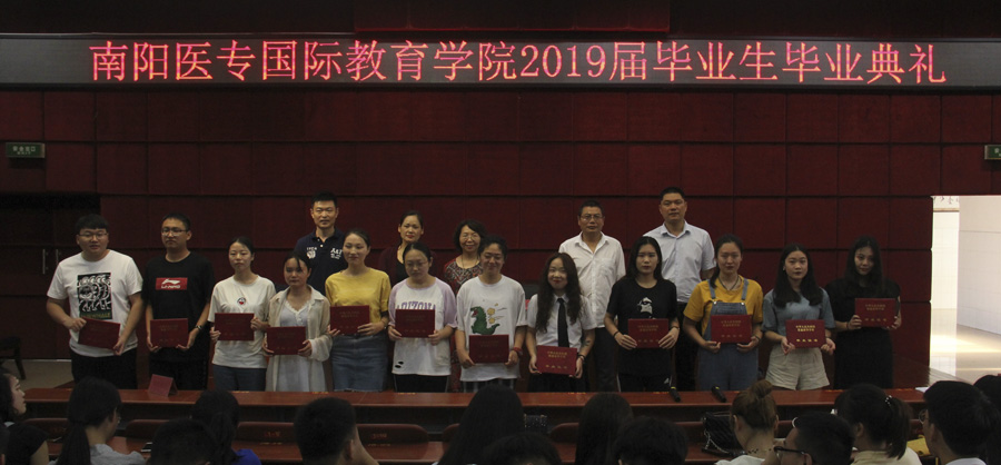 范卫杰宣读河南省教育厅关于表彰2019年河南省优秀应届大专毕业生的决定和南阳医学高等专科学校国际教育学院准予2019年应届毕业生的决定。李连焕介绍国际教育学院2019届毕业生的整体情况,本届毕业生558人,有11人获得省级优秀毕业生、三好学生和优秀学生会干部,79人通过专升本,33人投身“三支一扶”锻造火热青春。李弋希望大家谨记校训,做一个医德高、医术精,受人尊敬的人。希望大家常会母校看看。院领导给优秀毕业生颁奖。
