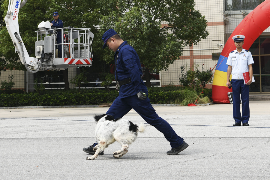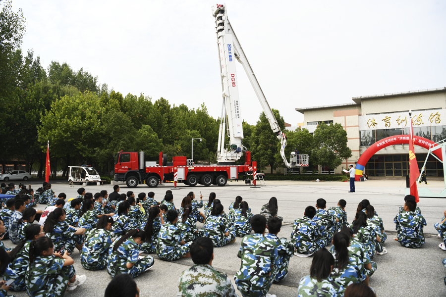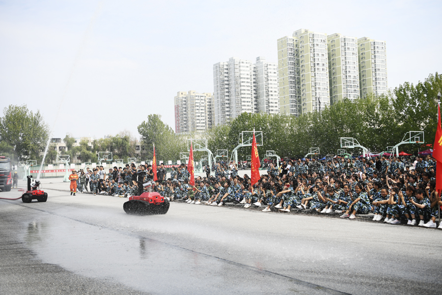 上午10:30分,古晓同志致辞并宣布活动开始。市消防支队田教官结合校园火灾案例和常见的火灾事故,详细讲解火灾报警的常识、日常用火用电的注意事项,初起火灾扑救方法和疏散逃生知识。市消防特勤中队20余名消防官兵和7辆功能不同的消防车把活动推向深入。他们利用先进的设备和高超的技艺,开展了服装展示、车辆展示、搜救犬表演、消防机器人技能展示、灭火器讲解、油槽灭火系列活动。官兵们的精采表演让同学们大开眼界,现场不时传来阵阵掌声和欢呼声。在消防官兵的指导下,同学们勇跃参与油槽灭火。同学们牢记“把销子,提管子,压把子”灭火器使用口决,在一次次从容扫射灭火中,掌握灭火技能的成就感和自豪感洋溢在笑脸上。