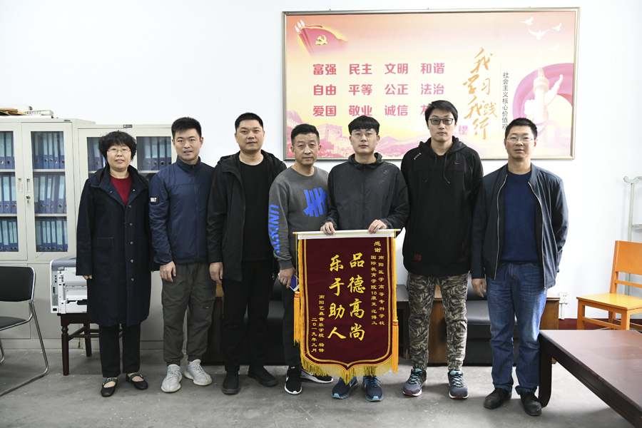 本网讯(文/学生处余飞海)10月14日上午,南阳艺森音乐学校杨先生受其爱人陈女士委托,专程到学校答谢拾金不昧、乐于助人的我校梁安迪、倪海荣和范博文三名学生,并送上“拾金不昧、品德高尚”和“乐于助人品德高尚”两面锦旗,学生处处长孟晓红和临床医学系、国际教育学院相关领导参加了本次活动。