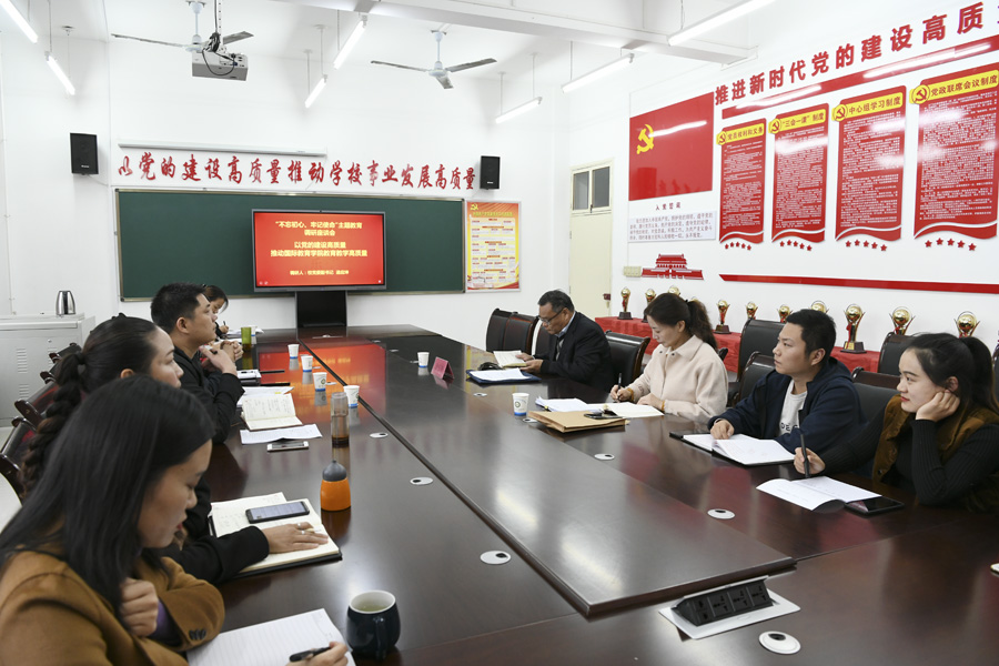 会前,党总支全体党员同志填写了“不忘初心、牢记使命”主题教育调查问卷。党总支书记张少羽紧扣调研主题,详细汇报了新形势下党总支探索构建的424(1)大思政教育新格局,反映了辅导员在职称晋升、值班住寝、人员配备等方面存在的问题,提出了设置辅导员职称晋升专项指标、招聘专职住公寓辅导员等改进思路。李弋院长汇报了“不忘初心、牢记使命”主题教育开展取得的初步成效,着重汇报了在外教助教翻译、学生参赛、生源、交换生选派、专升本考试等方面存在的问题,就如何提升教学质量提出了双语教学机制保障、参赛名额分配等建议。范卫杰副院长就党支部主题教育学习及开展的特色自选动作进行了具体汇报。其他同志也进行了发言。