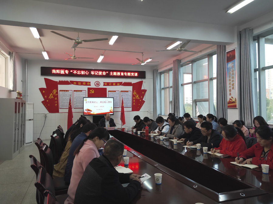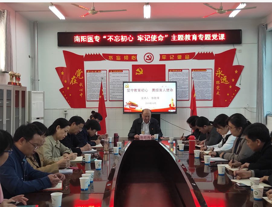 张胜海从共产党人的初心和使命是什么,我们为什么要“不忘初心、牢记使命”,如何以实际行动做到“不忘初心、牢记使命”等三个方面进行了详细阐述。他指出,中国共产党人的初心和使命就是要为中国人民谋幸福,为中华民族谋复兴,对于教育工作者而言,就是要坚守教育报国的初心、肩负立德树人的使命,努力做到“六个要”:理论要自觉、政治要过硬、理想信念要坚定、本领要高强、作风要优良、纪律要严明。他要求全体党员不断加强理论学习,不断提高政治站位,进一步苦干实干,在工作中有新作为、新突破,在时代洪流中书写我们的精彩人生。