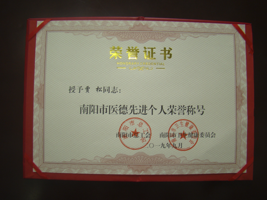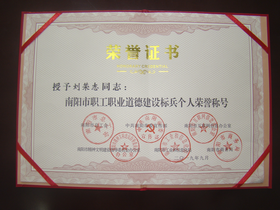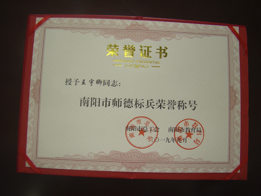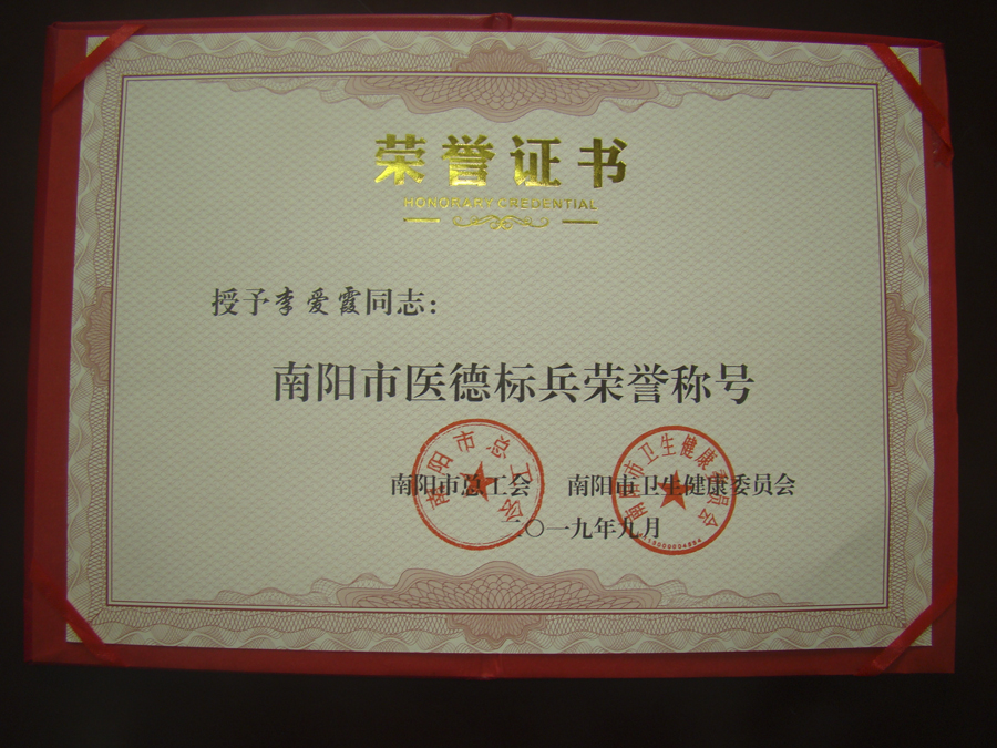 本网讯(文/工会朱东民)南阳市总工会近日表彰了一批“全市职工职业道德建设标兵个人和标兵单位”,我校基础医学部刘荣志同志荣获“南阳市职工职业道德建设标兵个人”、科研中心王宇卿同志荣获“南阳市师德标兵”、二附院李爱霞同志荣获“南阳市医德标兵”、三附院贾松同志荣获“南阳市医德先进个人”等荣誉称号。