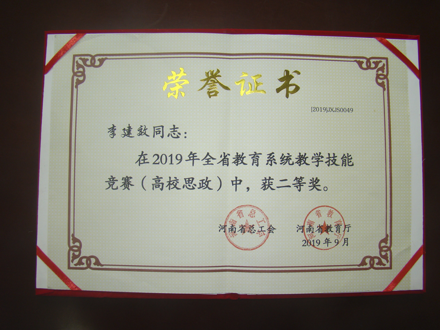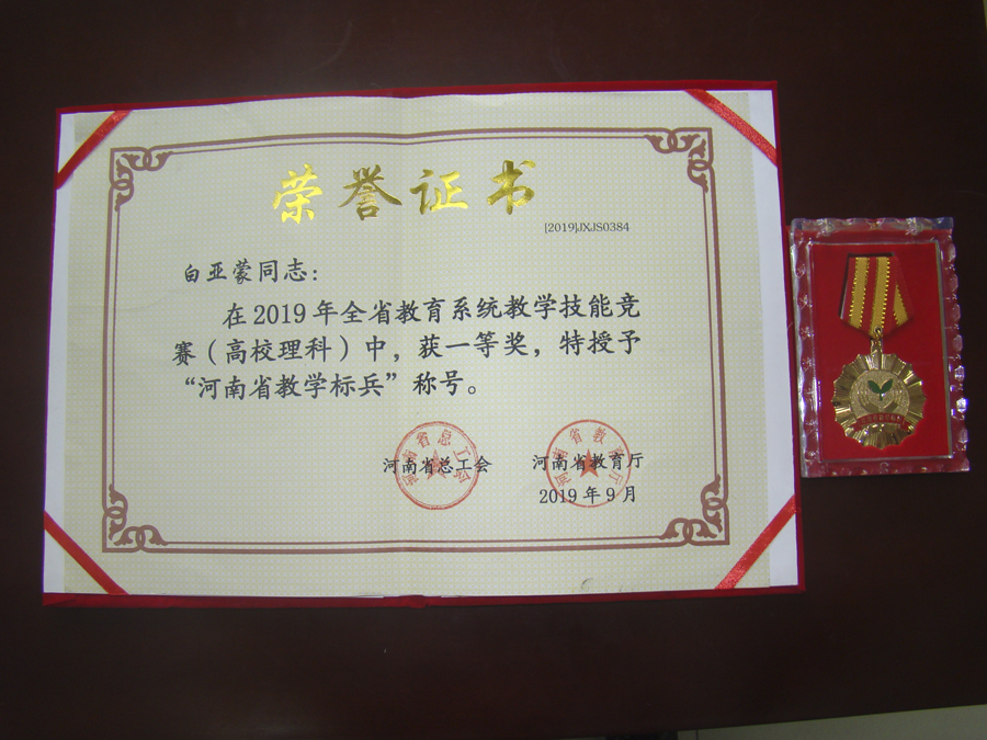 本网讯(文/工会朱东民)近日,河南省总工会、河南省教育厅联合下发《关于表彰2019年全省教学技能竞赛获奖个人的决定》,我校公共教学部老师白亚蒙荣获高校理科组一等奖,并被授予“河南省教学标兵”,政治理论教学部老师李建效荣获高校思想政治组二等奖。