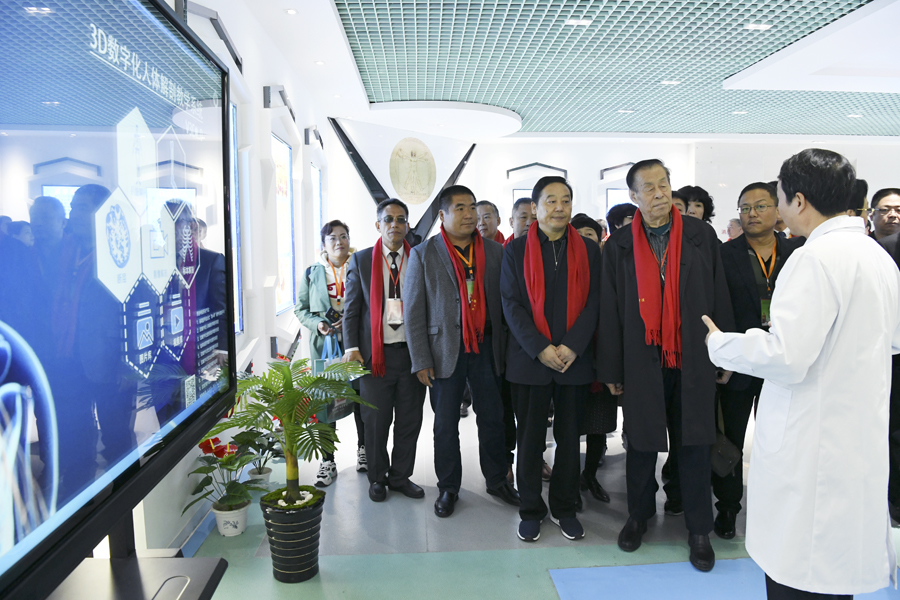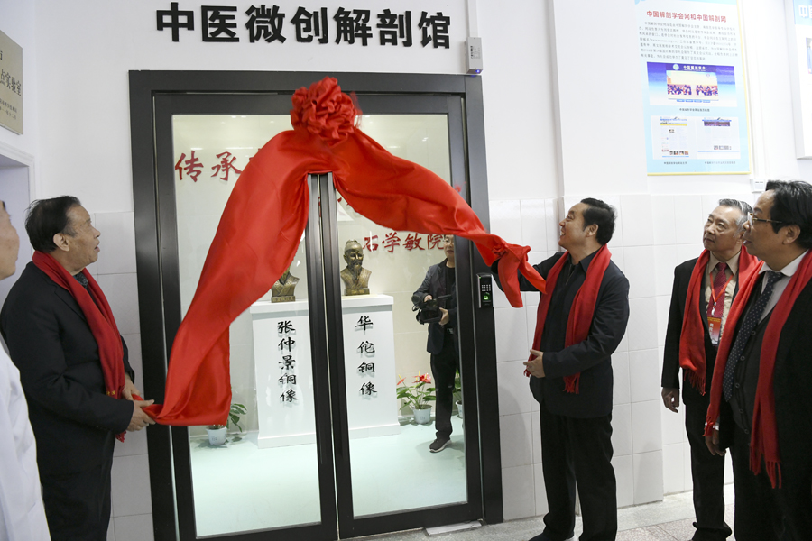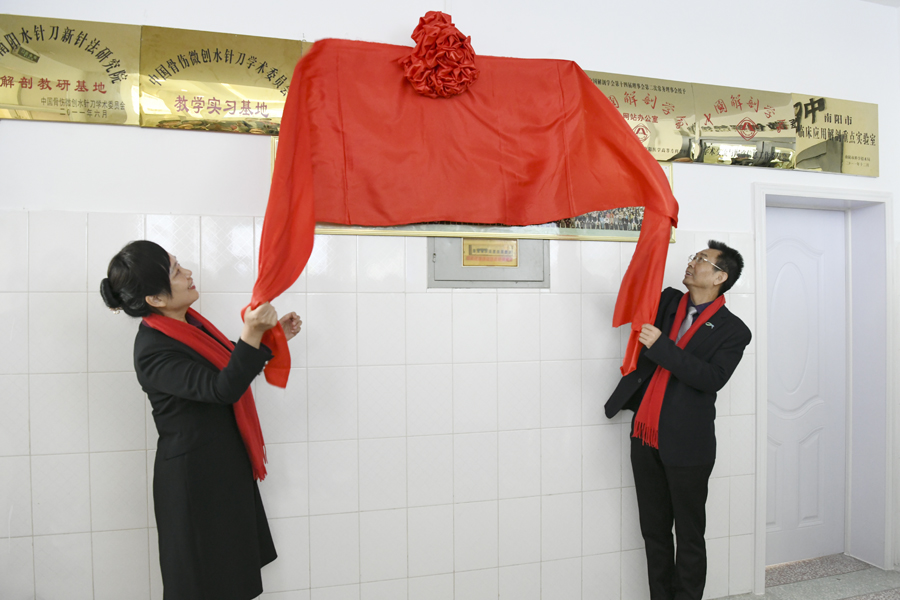 本网讯(文/基础医学部 马瑜红)2019年10月27日上午,国内首家“中医微创解剖馆”开馆仪式暨教育部认定“国家级中医微创应用技术协同创新中心”揭牌仪式在南阳医学高等专科学校人体生命科学馆举行。中国工程院院士、国医大师石学敏院士,与南阳医学高等专科学校党委书记全新明,为“中医微创解剖馆”揭牌。中华中医药学会副秘书长孙永章先生,与南阳医学高等专科学校副校长范真教授,为“国家级中医微创应用技术协同创新中心”揭牌。中华中医药学会国际中医微创联盟主席、中国中医药研究促进会中医微创专业委员会主任委员吴汉卿教授、中国中医药研究促进会副秘书长王凯、瑞典针灸学会会长杨春贵教授等著名专家学者及一百多名代表参加仪式,范真副校长、基础医学部主任刘荣志、党总支书记梁武、针灸骨伤系主任孙欣峰、副主任陈春华等参加仪式。